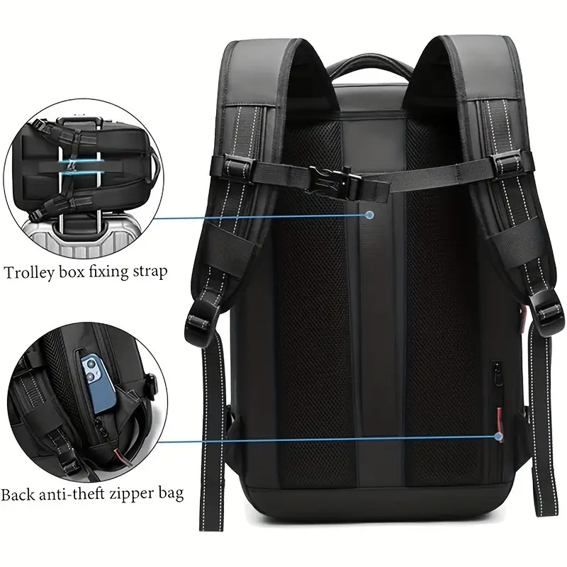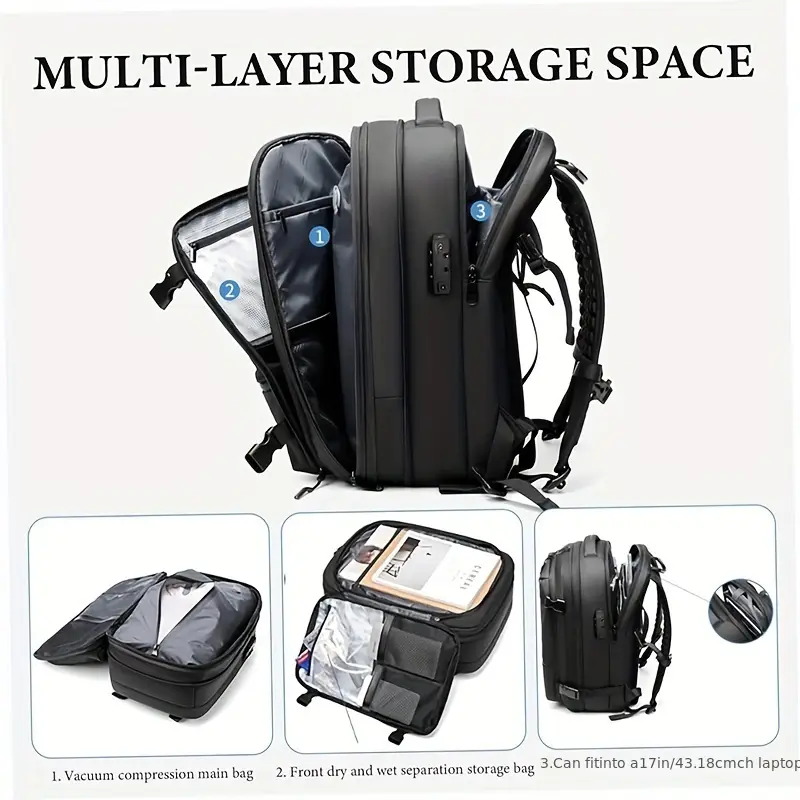 Vacuum Compression System: Comes with integrated vacuum functionality and Airback bags that compress your clothes and gear, maximizing space by up to 50% — perfect for overpackers and long trips.