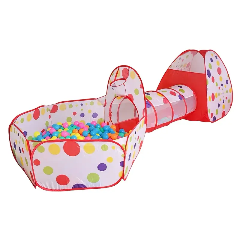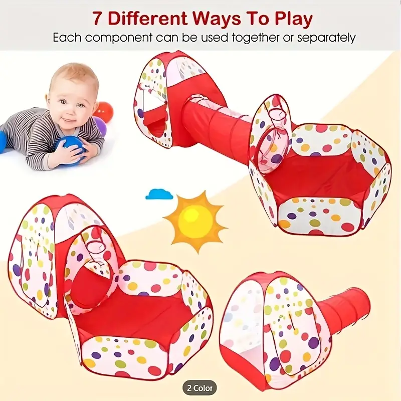 Bring endless joy to your kids with this vibrant red & white polka dot playhouse tent set, featuring a spacious playhouse, a fun crawling tunnel, and a colorful ball pool. Made from durable, child-safe materials, this foldable and portable play structure is perfect for both indoor and outdoor adventures. Ideal for boys and girls, it encourages imaginative play, active crawling, and social interaction. A perfect birthday or holiday gift that creates a playful atmosphere and hours of entertainment.