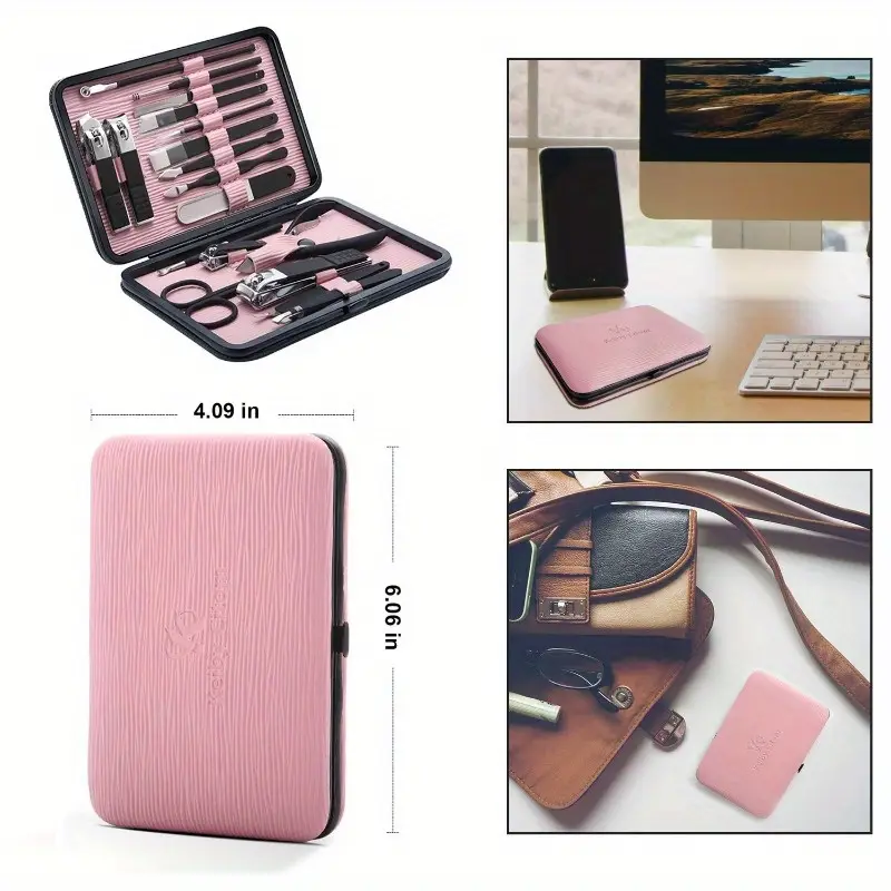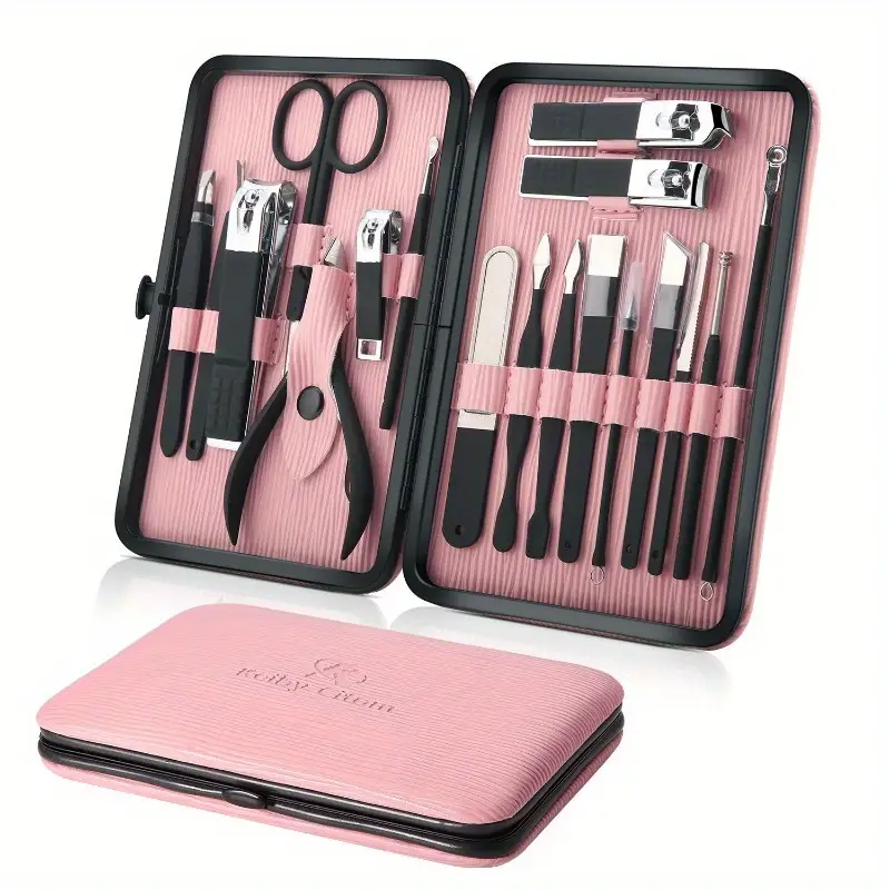 Take your nail care routine to the next level with this Professional Manicure Set, featuring 18 high-quality stainless steel tools for complete hand, foot, and facial grooming. Designed with elegance and functionality in mind, this pink grooming kit is perfect for home use or travel. Whether you’re trimming nails, shaping brows, or exfoliating rough skin, this set has everything you need in one compact case.