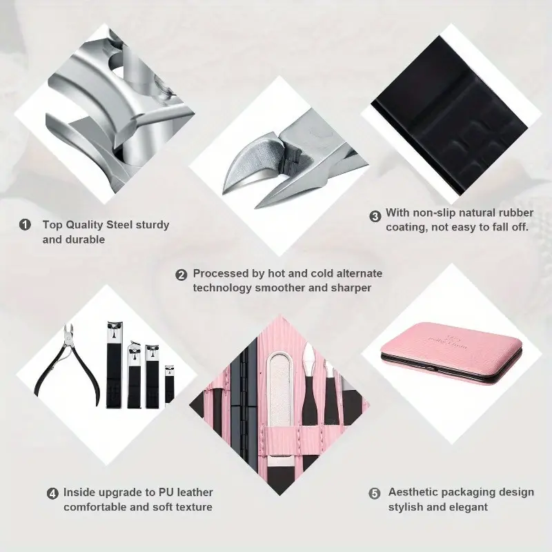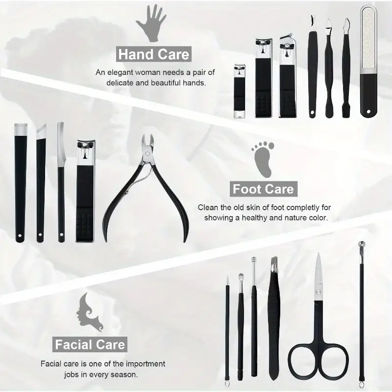 18-in-1 Grooming Tools: Includes nail clippers, cuticle trimmers, tweezers, scissors, nail file, ear pick, and more—covering manicure, pedicure, and facial care.
