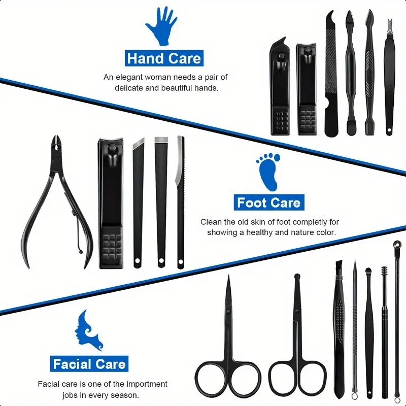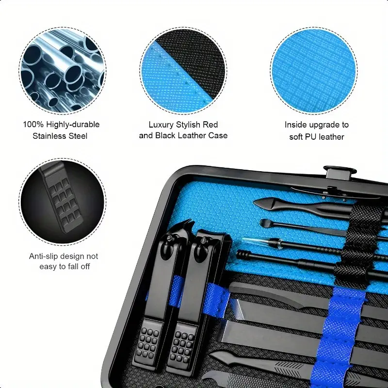 This comprehensive grooming kit features 18 professional-grade nail tools crafted from durable stainless steel, perfect for manicure and pedicure care at home or on the go. Packaged in a luxurious black and blue case, it combines functionality with style, making it ideal for travel or everyday use.